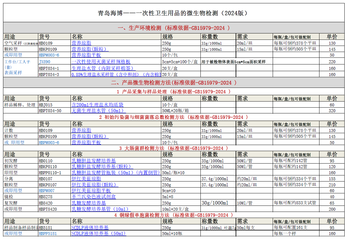 青岛海博--一次性卫生用品(GB15979-2024)的微生物检测培养基核算表(2024版)