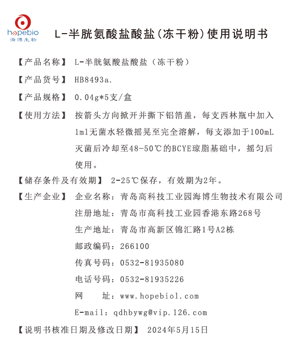 HB8493a L-半胱氨酸盐酸盐(冻干粉)使用说明书