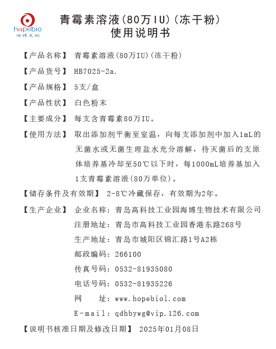 HB7025-2a.青霉素溶液(80万IU)(冻干粉)说明书