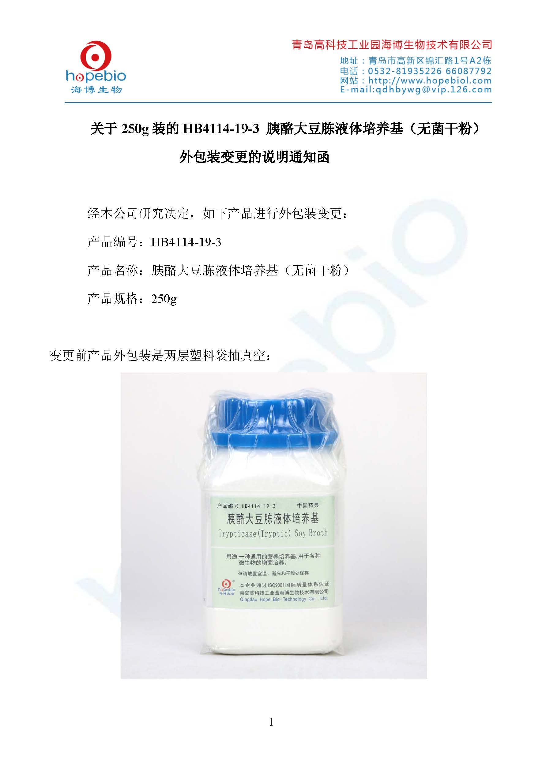 青岛海博--关于250g装的HB4114-19-3胰酪大豆胨液体培养基(无菌干粉)外包装变更的说明通知函
