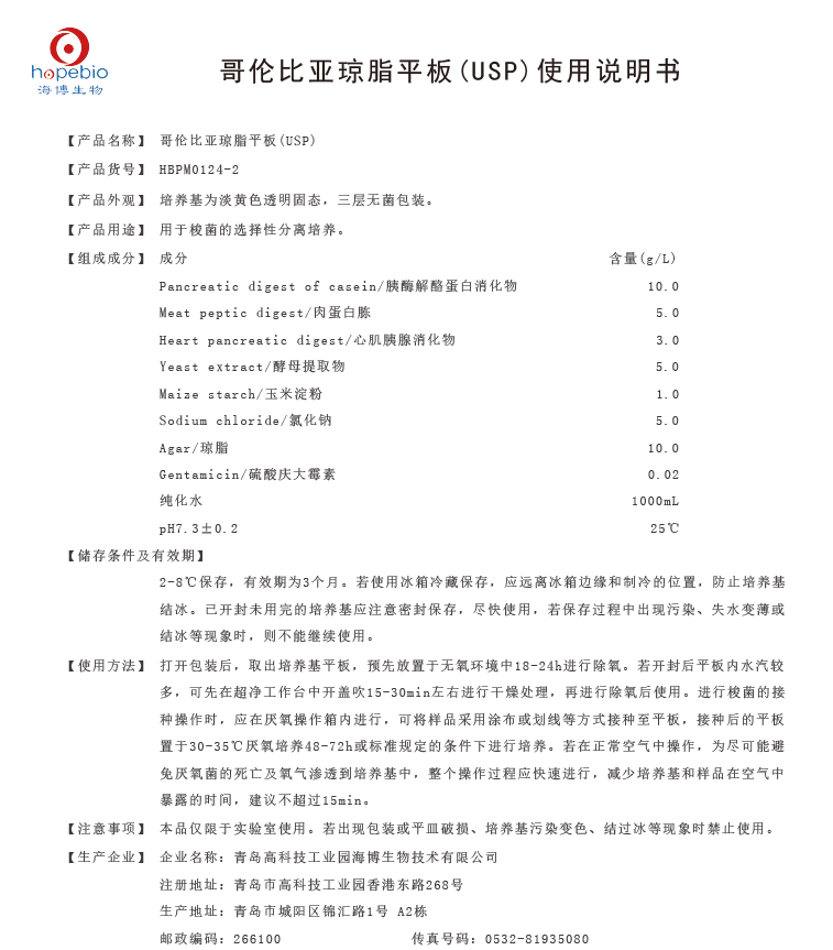 HBPM0124-2哥伦比亚琼脂平板(USP)使用说明书
