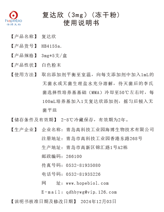 HB4155a.复达欣(3mg)(冻干粉) 使用说明书