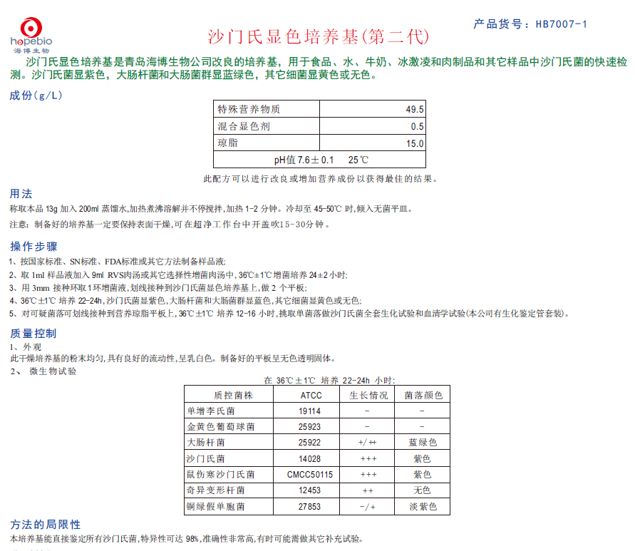 HB7007-1 沙门氏显色培养基(第二代)说明书