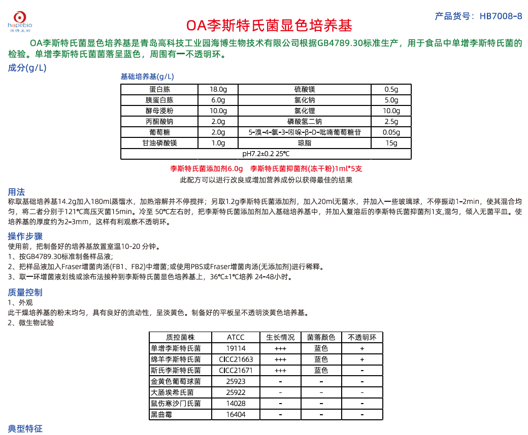 HB7008-8 OA李斯特氏菌显色培养基说明书